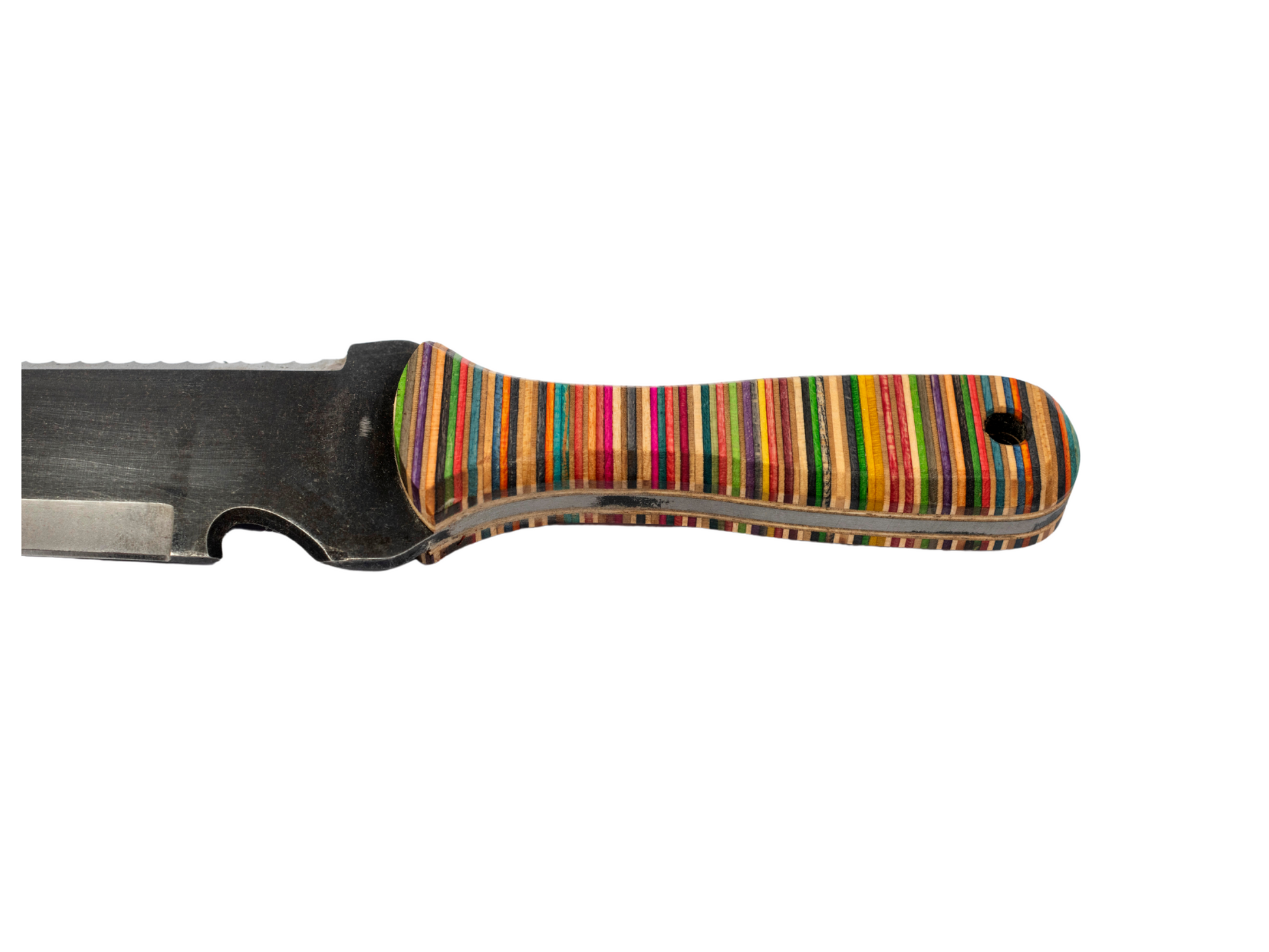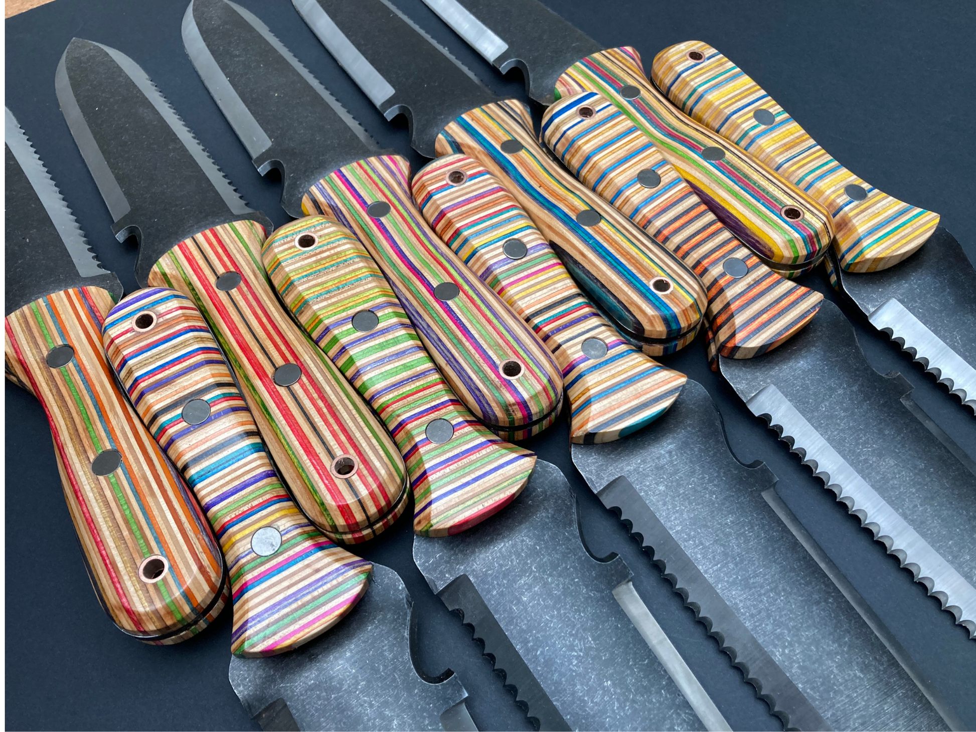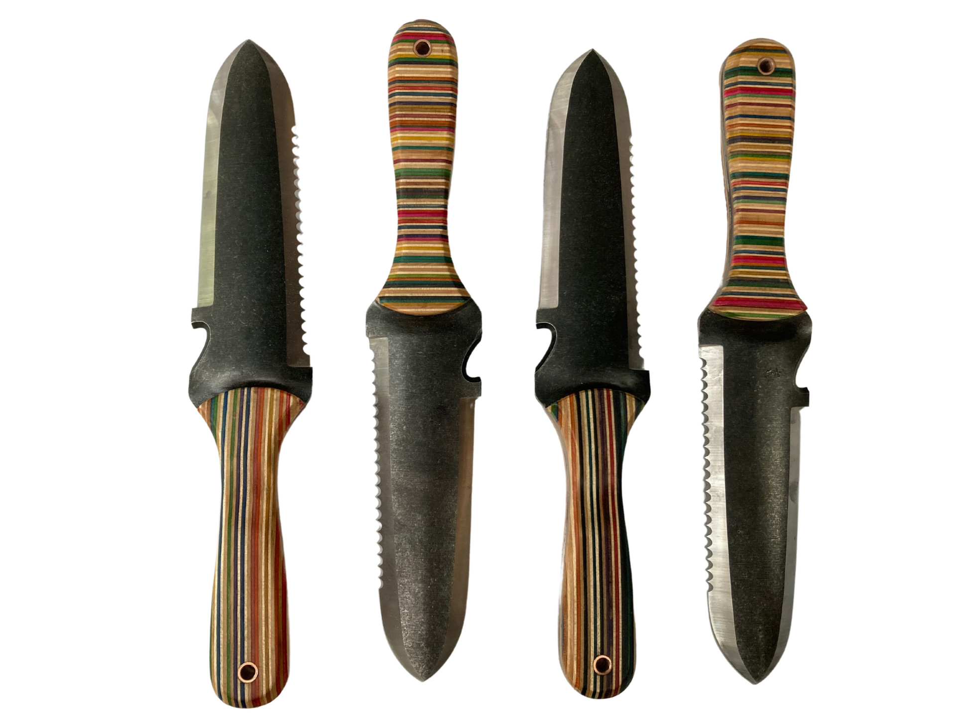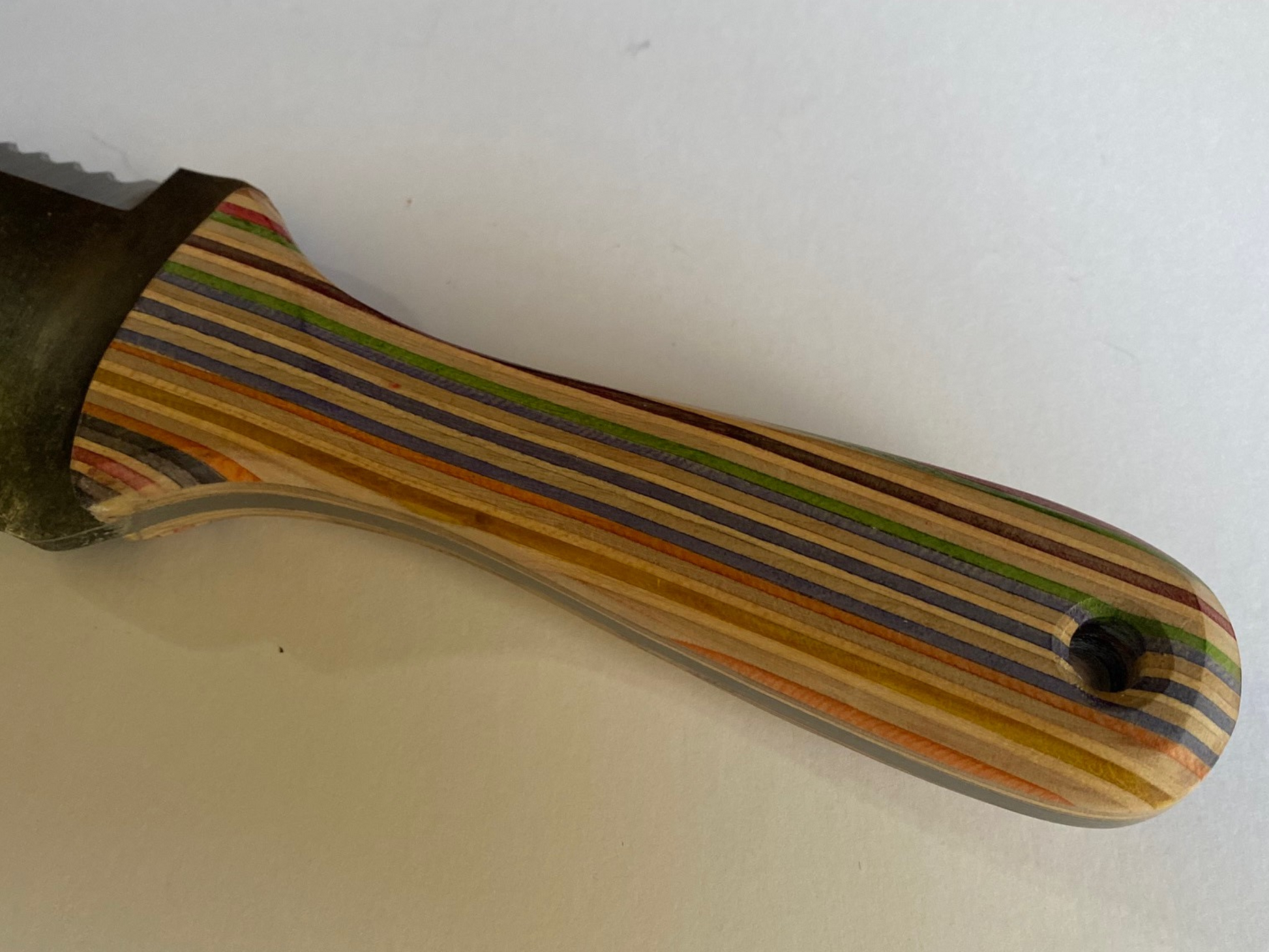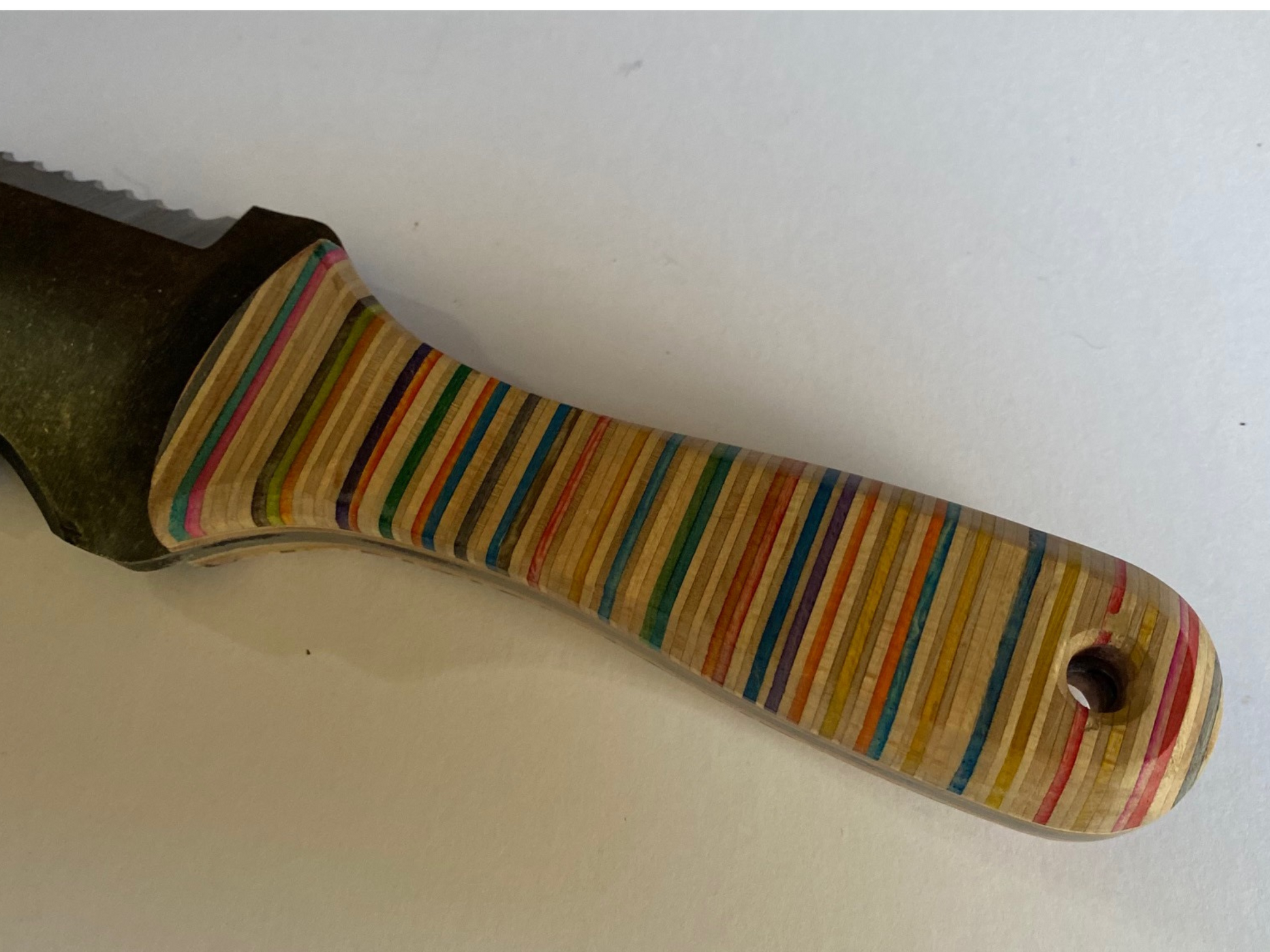 Recycling this material isn't an easy process. Damaged skateboards have to be sourced, grip tape removed and then larger blocks glued up. Only then can you actually start the making process. For these Hori Hori handles we turned to a local maker called Ben Footitt (@afterlifebf) who specialises in using Skatewood. He's done a great job for us with these and his ability to visualise the layout of the coloured laminates is outstanding.