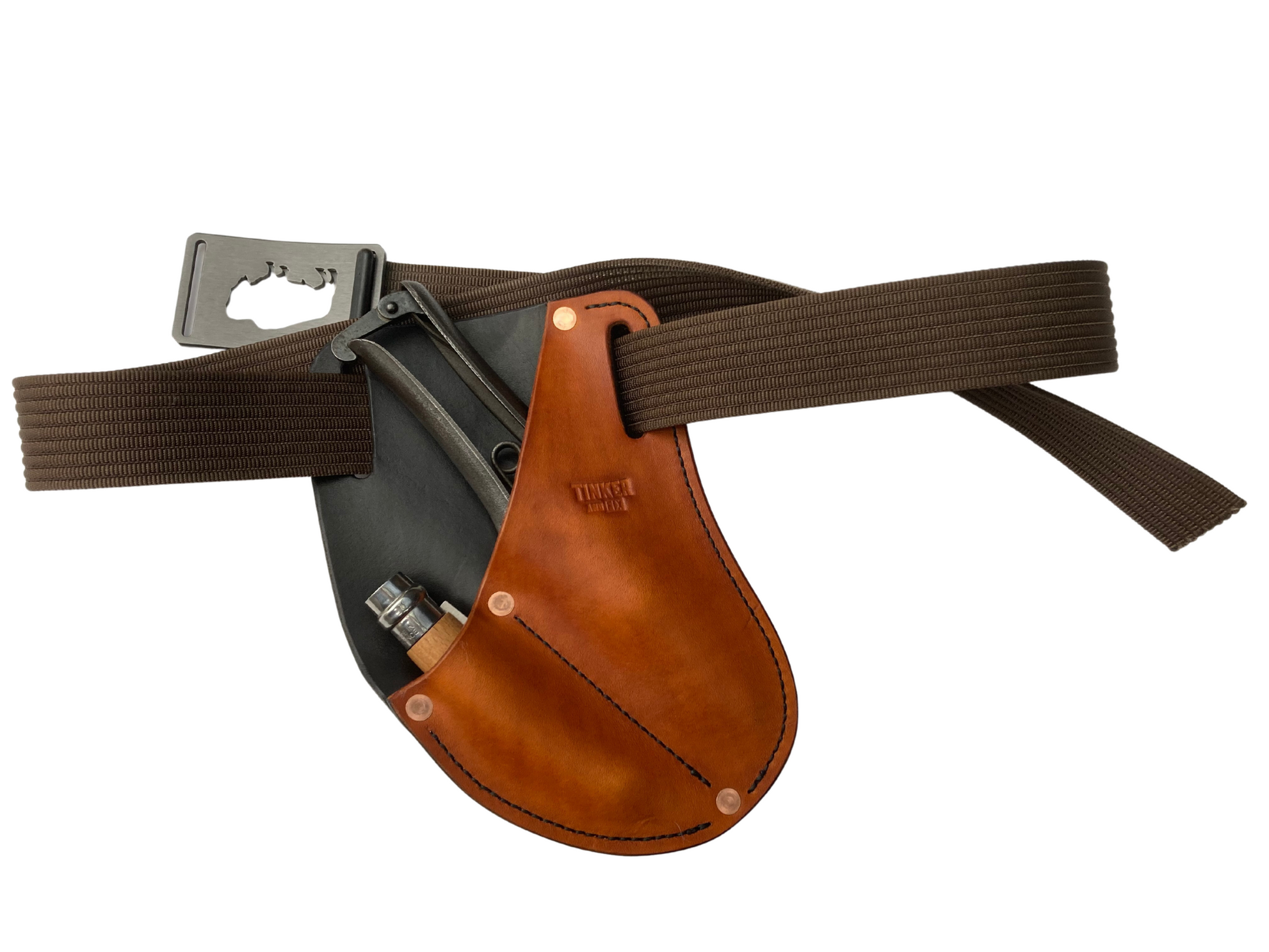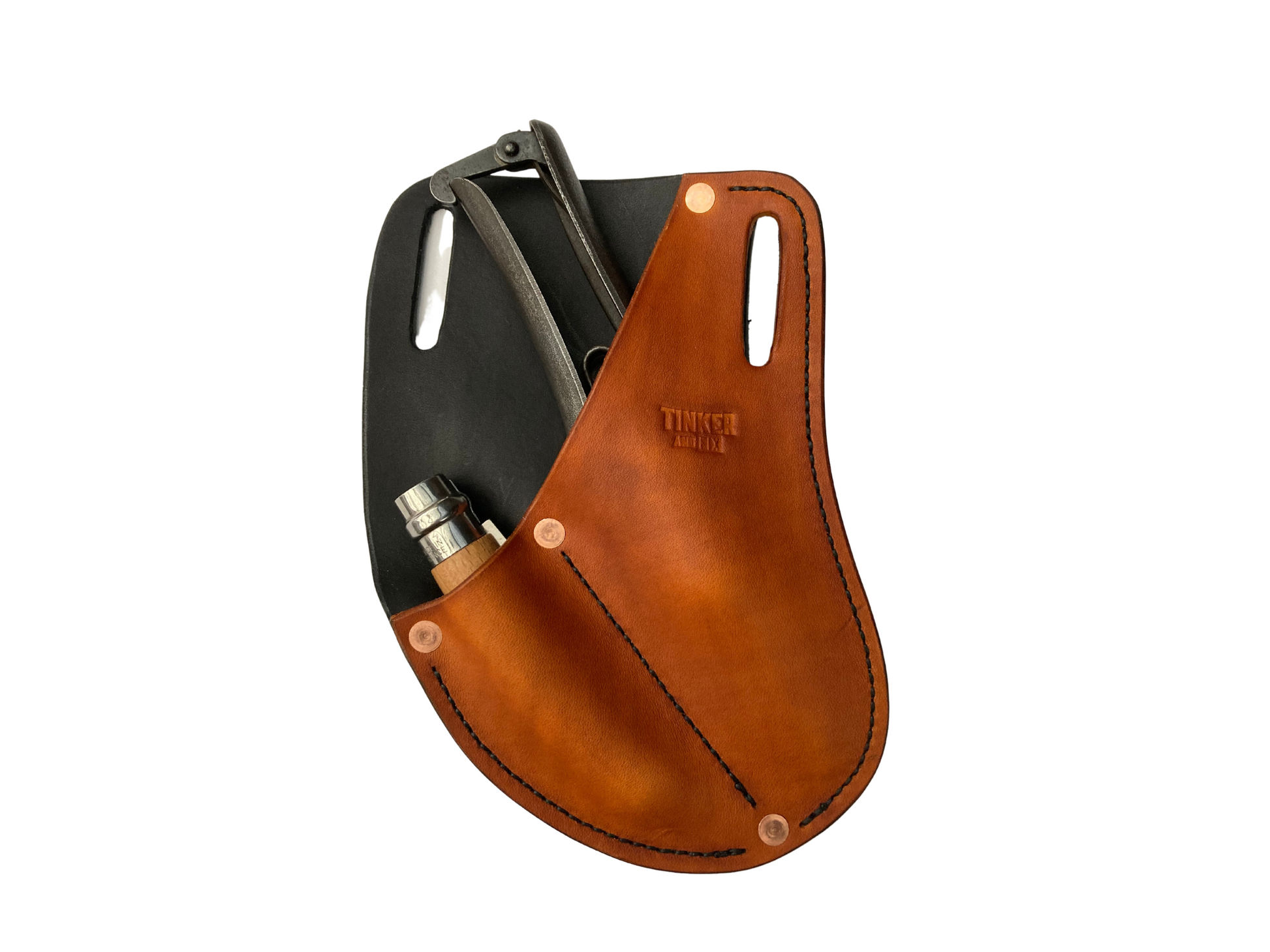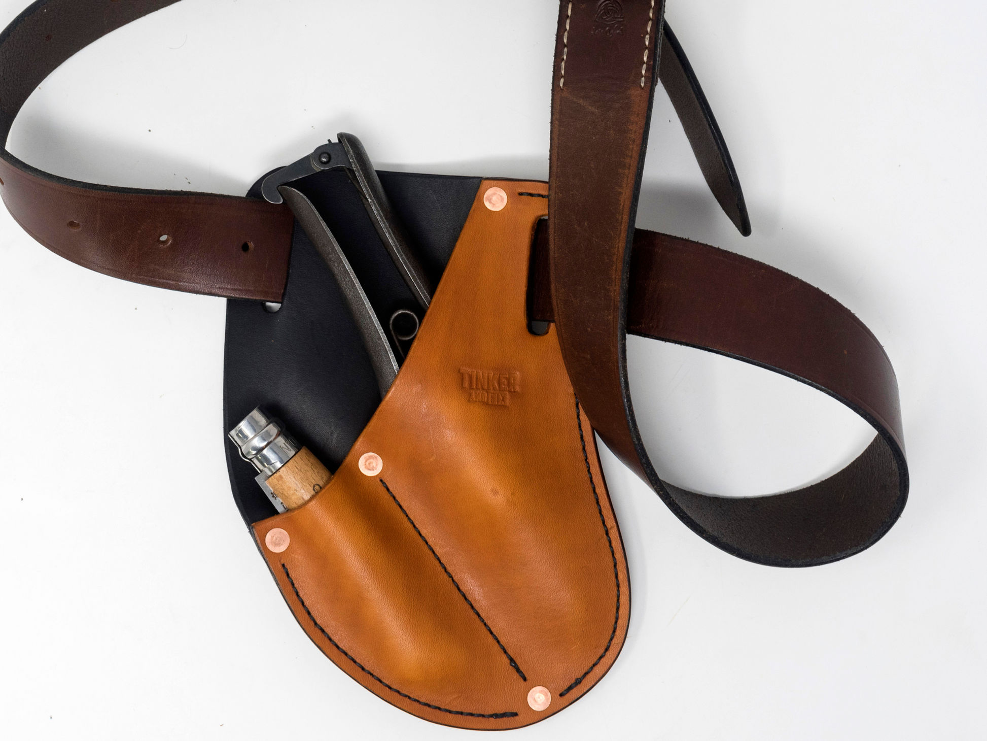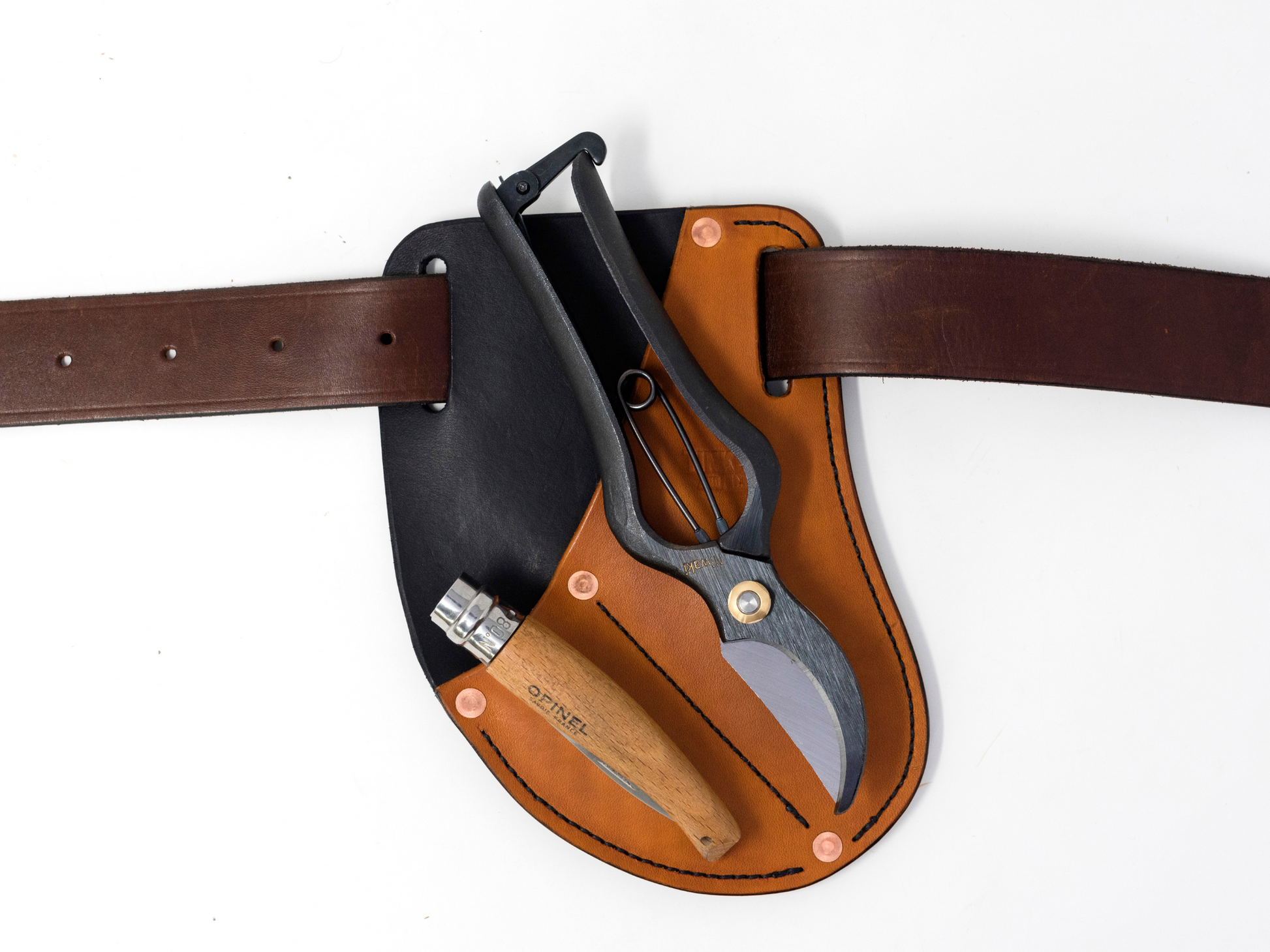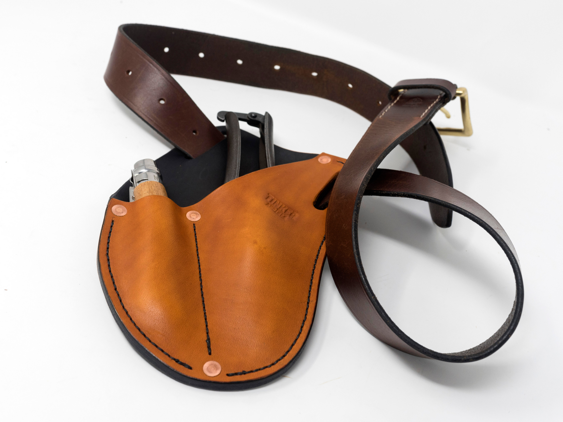 The holster is available on its own, or as a set with a new pair of Niwaki Sentei's and an Opinel garden knife. The belt is not included and just in the photo's for reference. Leather will mould to the shape of the tool and will be initially quiet tight. With use this will relax into a secure fit. If you are buying just the holster on its own it will be supplied "flat" and you'll stretch the leather when you insert your tools for the first time. We'll also supply a tin of our leather wax which helps with the moulding process and then can be applied overtime to keep the leather supple.