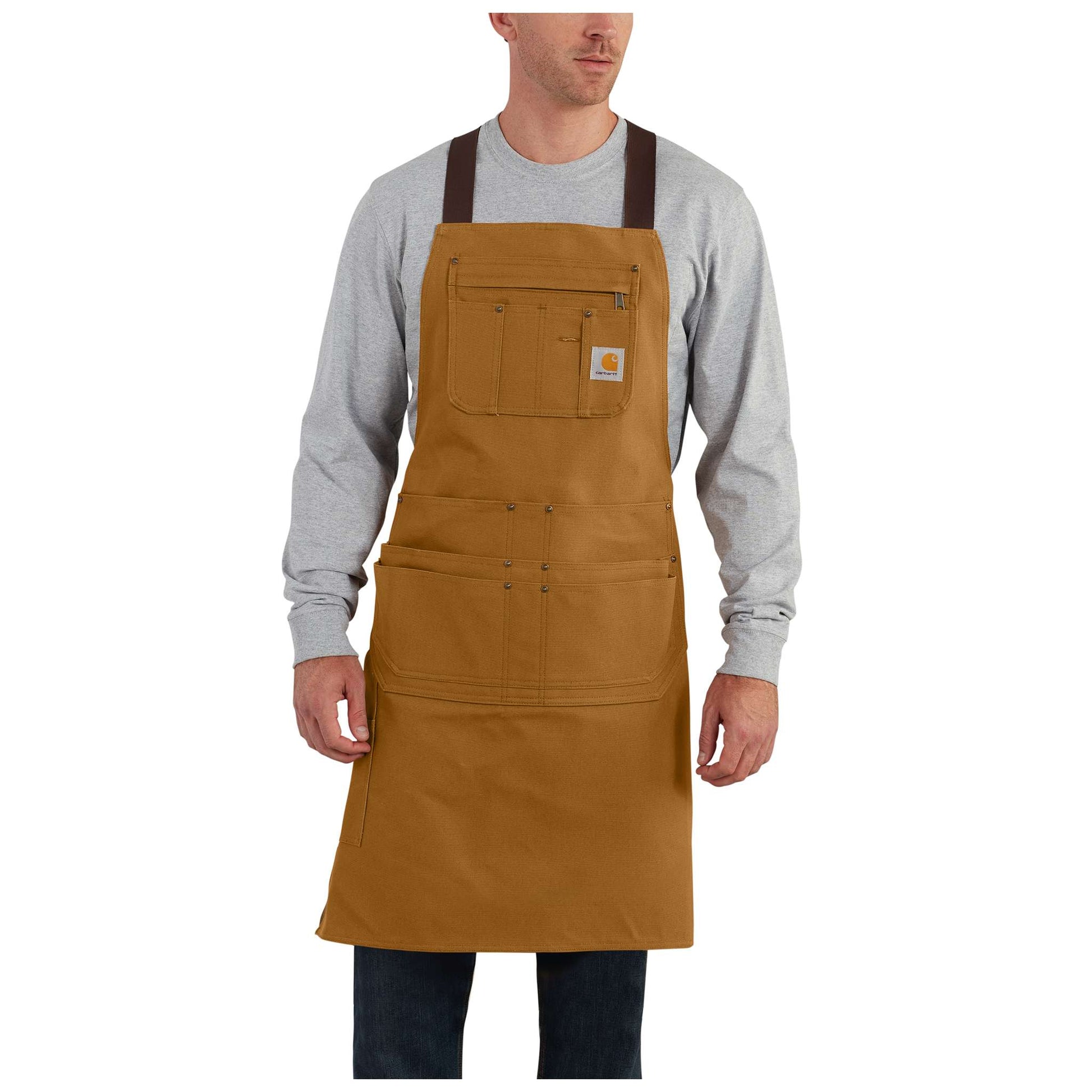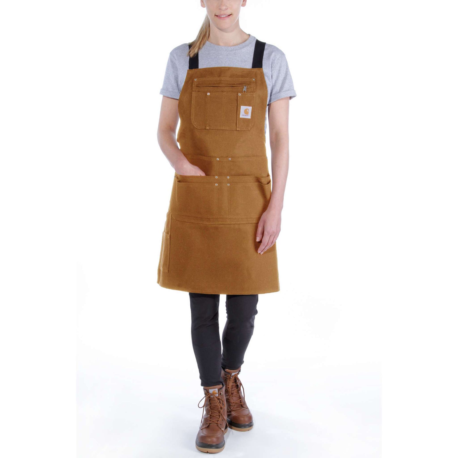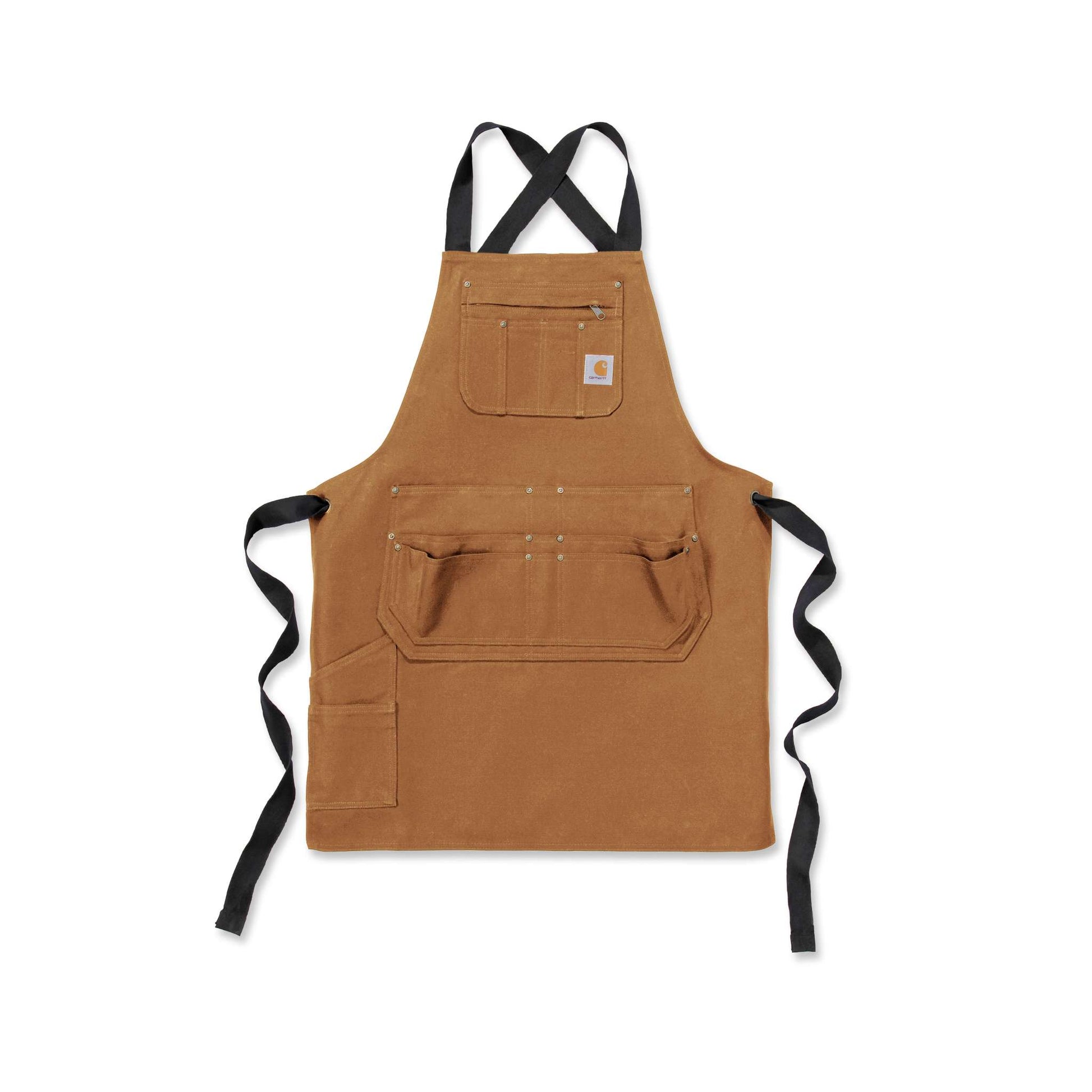 This apron uses Carhartt standard 12oz, firm hand, 100% ring spun cotton duck canvas. This means that when new the fabric feels stiff, but with time and wear develops its own shape and will nicely fit to you.