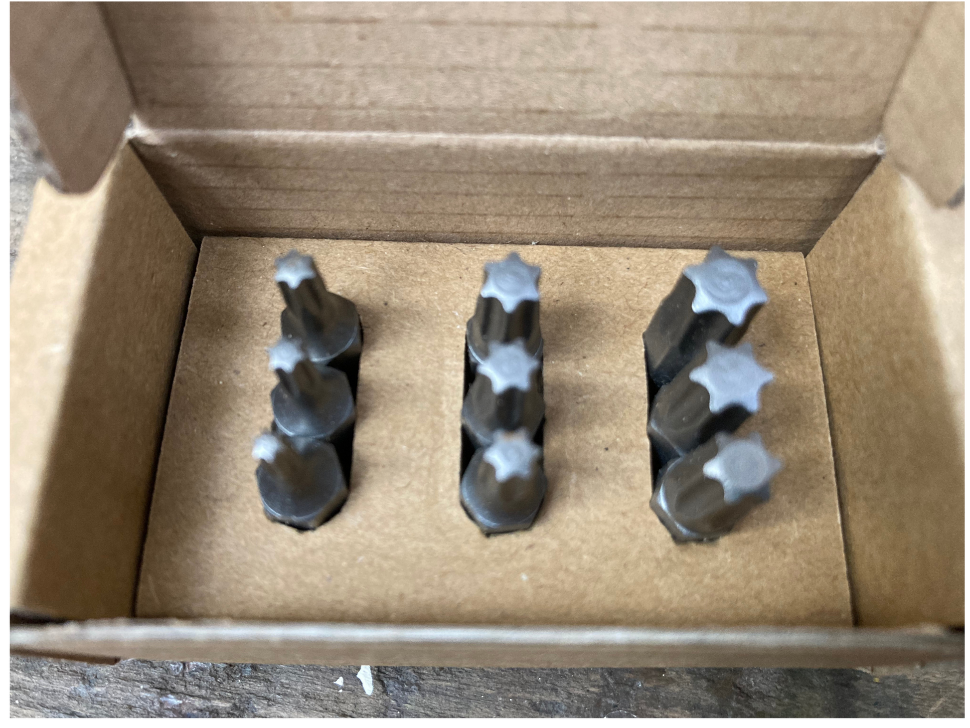 Torx head fittings have been around since the late 60's and are more commonly found on machinery and electronic goods. They are sometimes referred to a "star" fittings as they features a six pointed star shape designed to increase the surface area and reduce the likelihood of rounding the head.