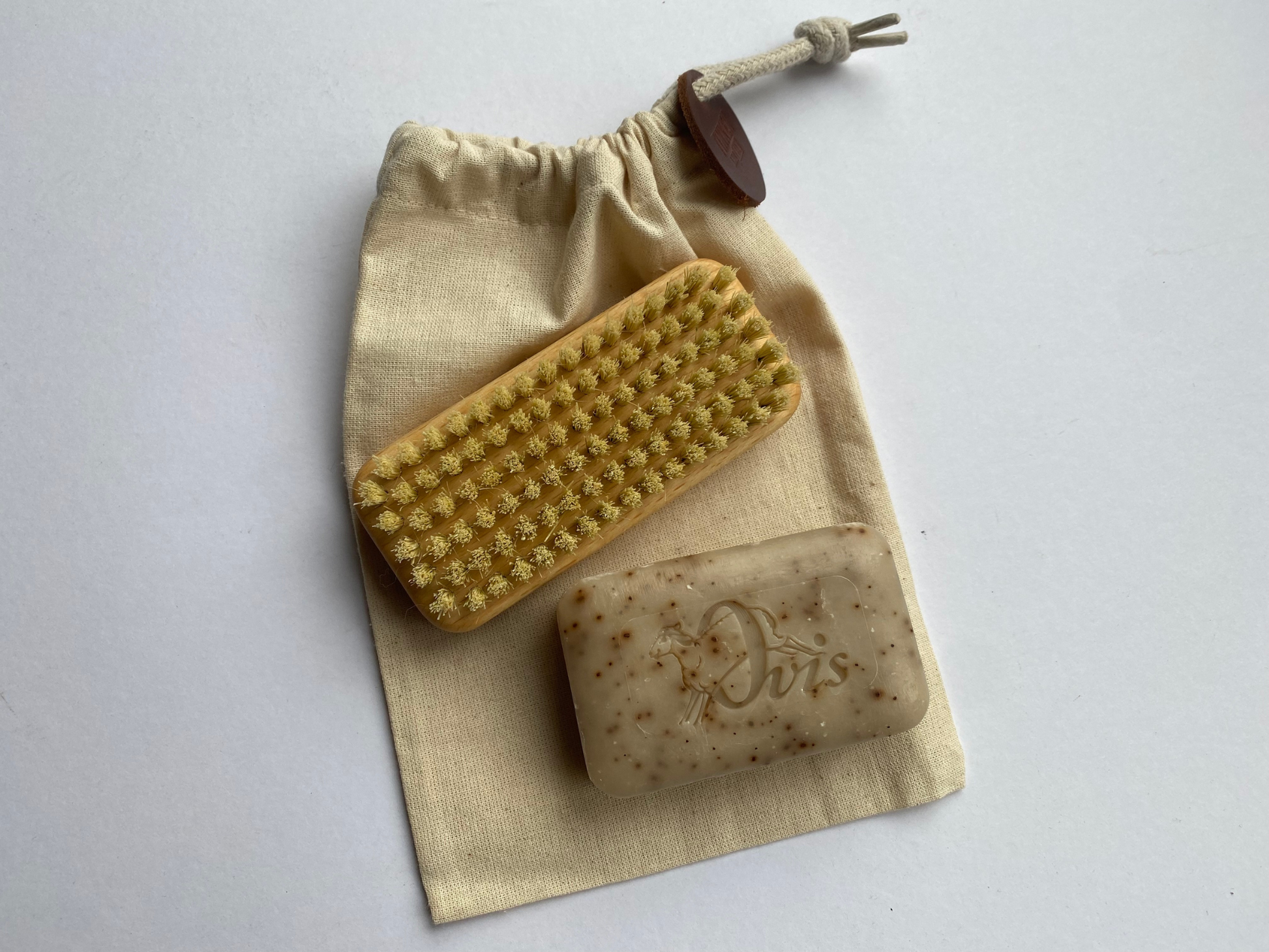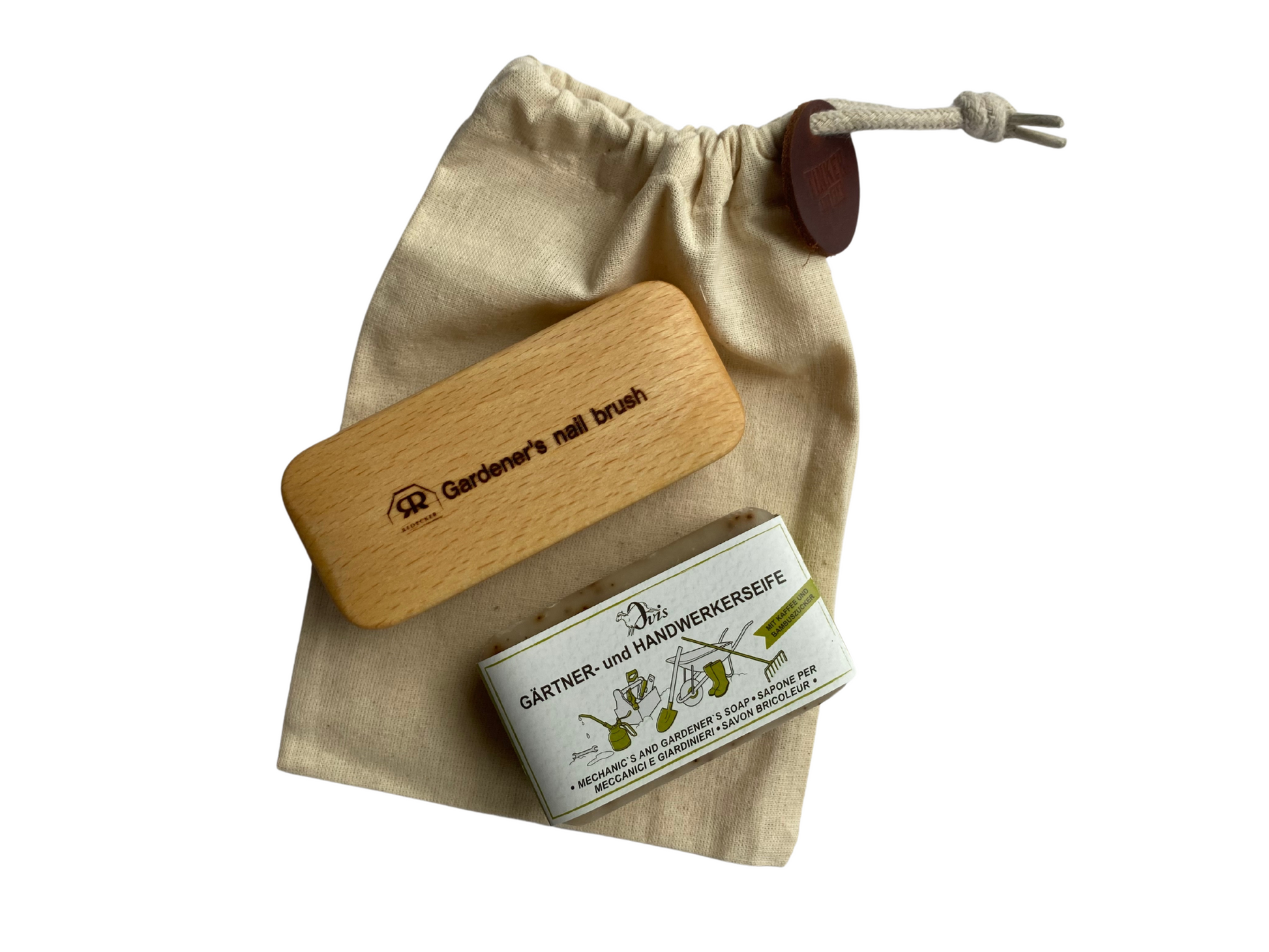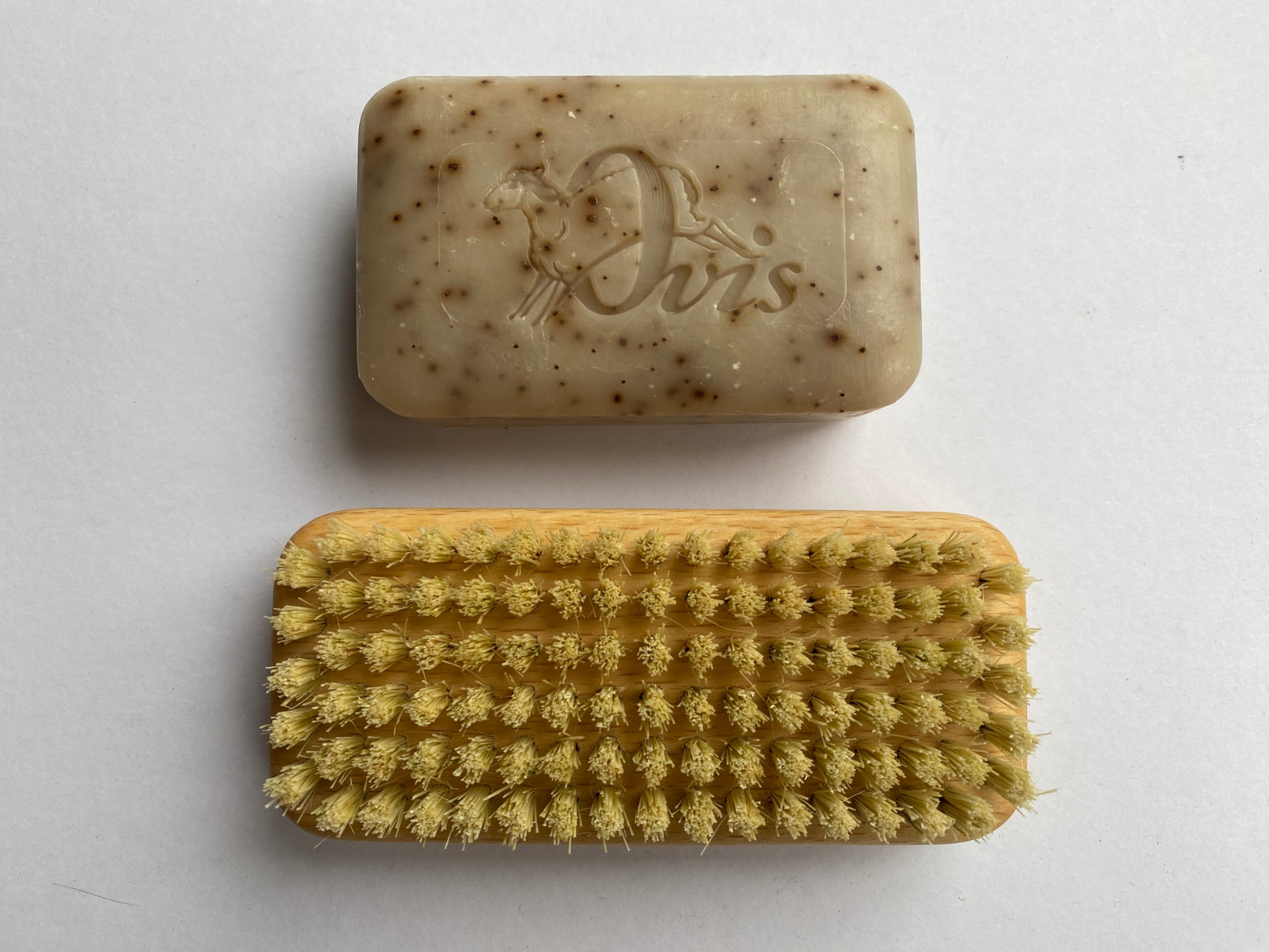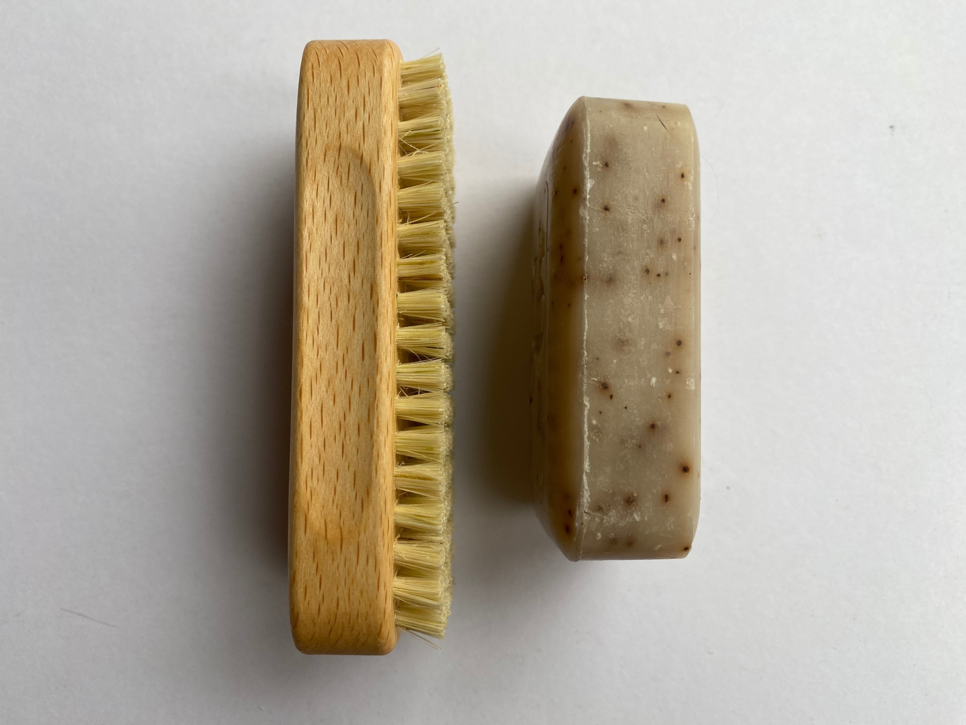 The nail brush that we sell is made in Germany by a brush company called Redecker. It's short, stiff, bristles are great for lifting soil and oil from your hands.