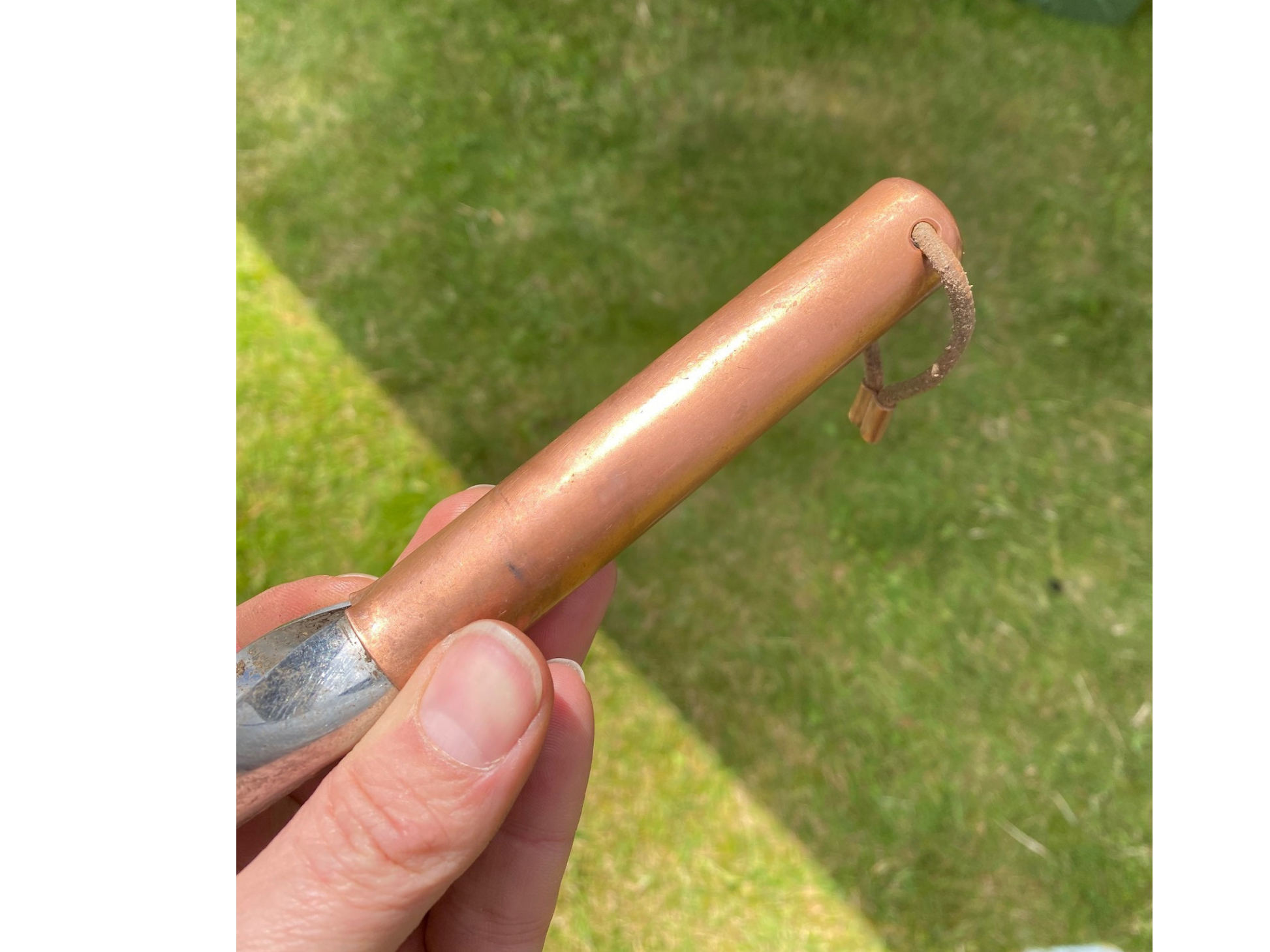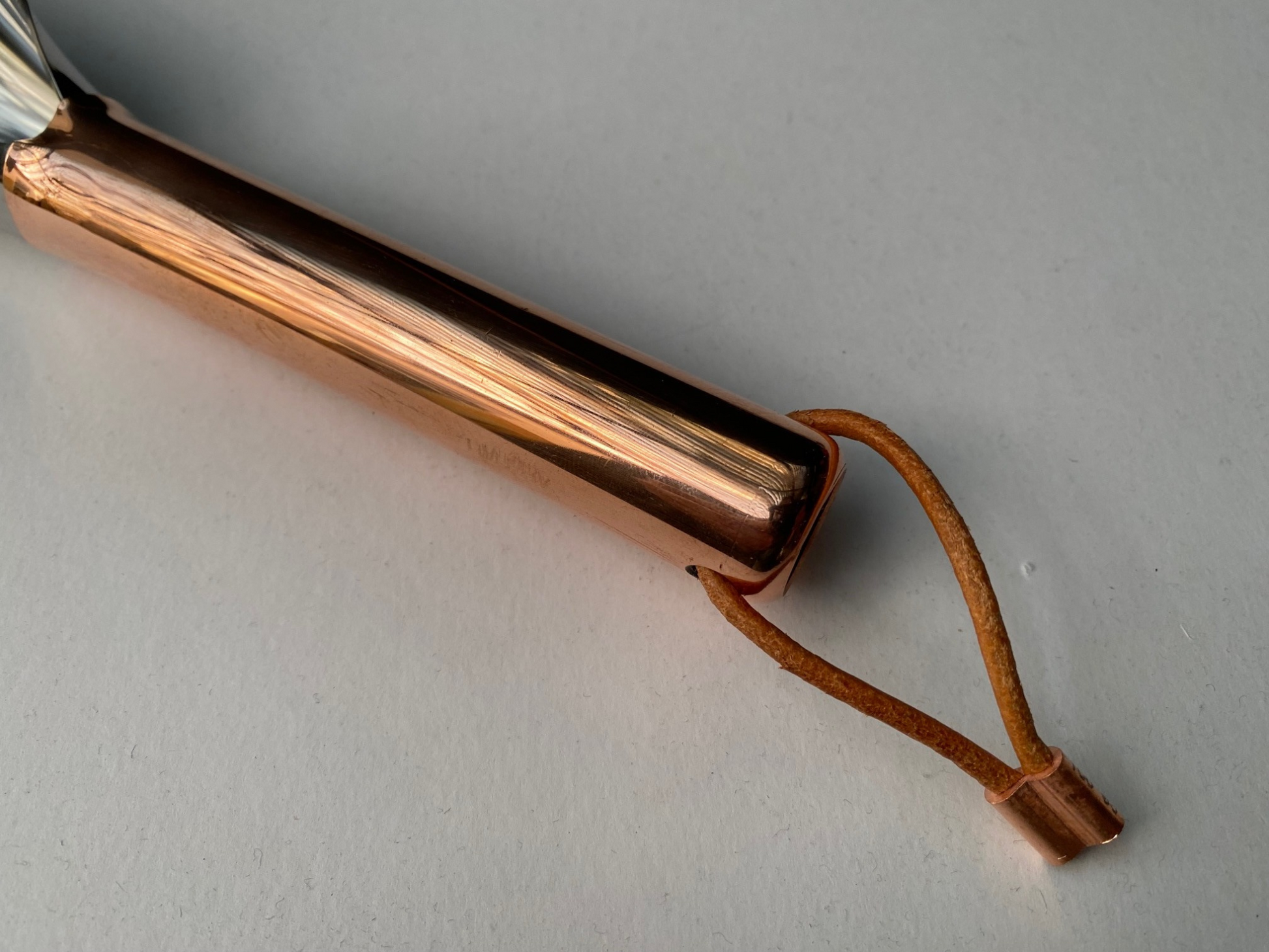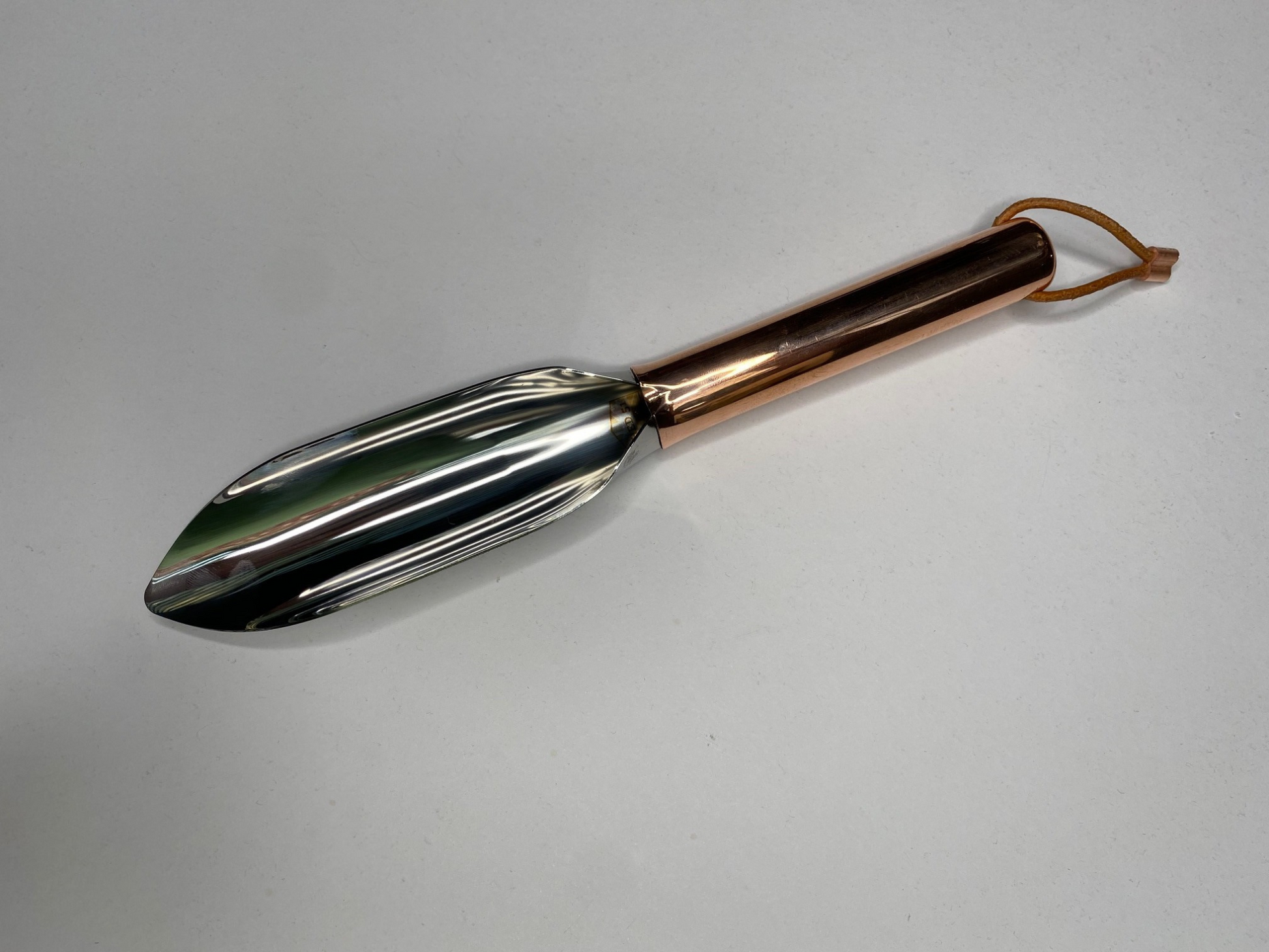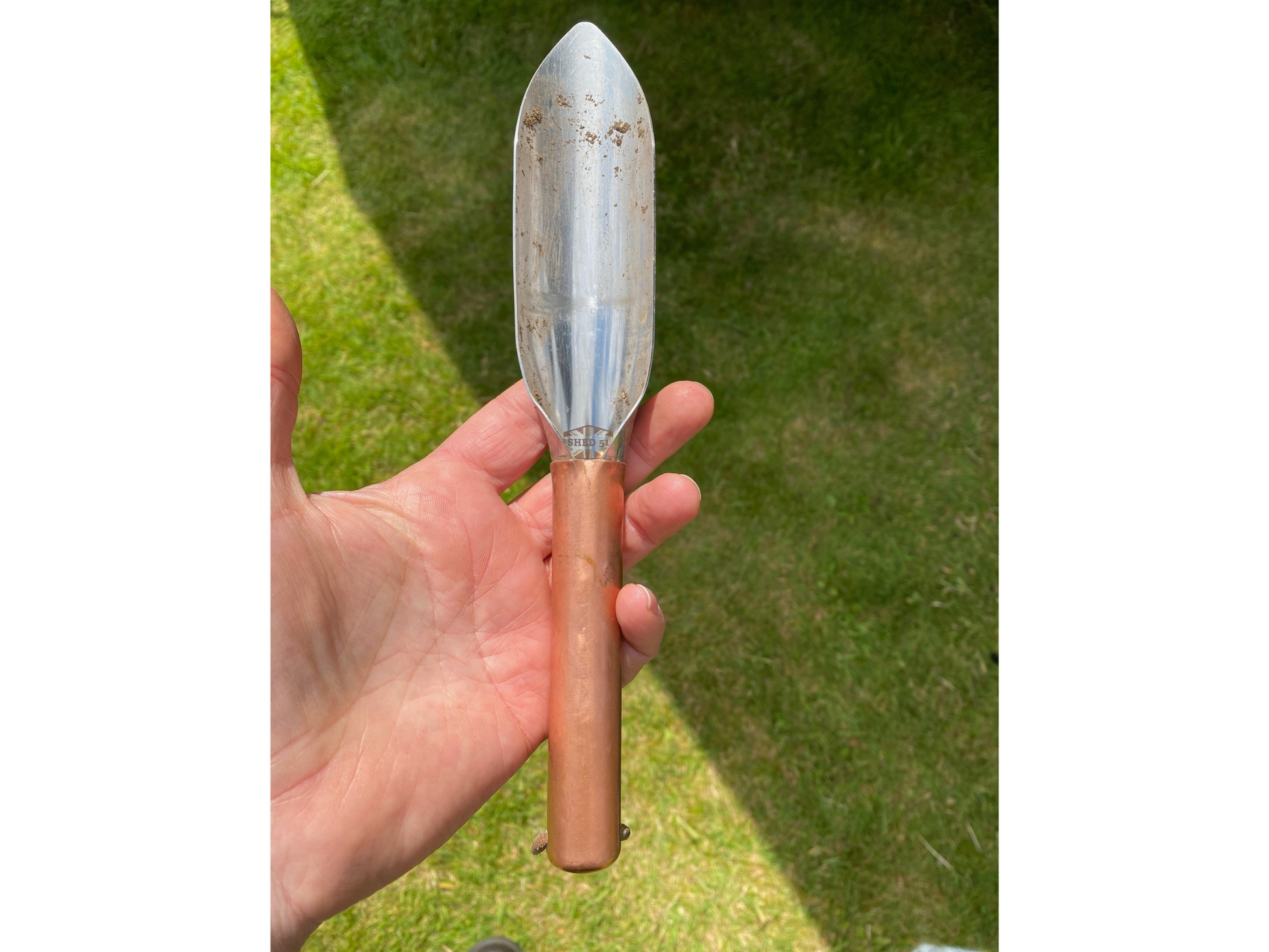 The handle is copper and the digging blade from stainless steel. Their clever design means no rivets or glue are needed in their assembly. Extremely light weight and durable. This standard length version weighs just 140grams, but will hold up to digging duties well.