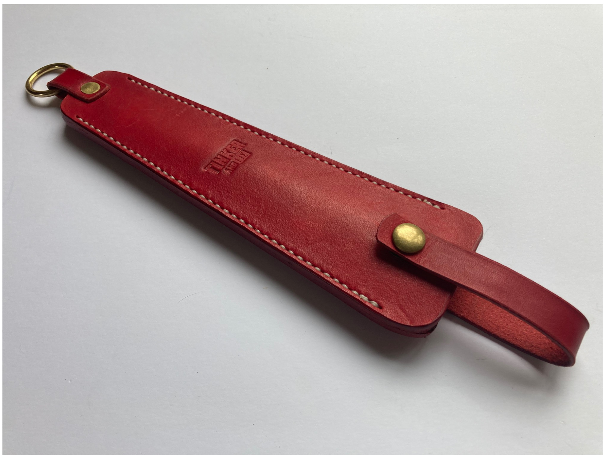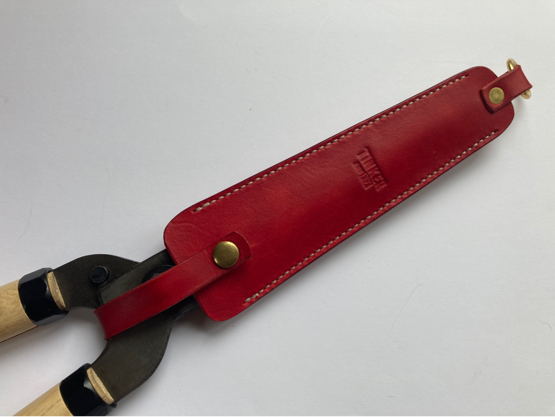 Shears can be difficult to store as they tend to open if hung. This sheath has a solid brass ring to allow it to be hung and a leather strap to secure the shear.