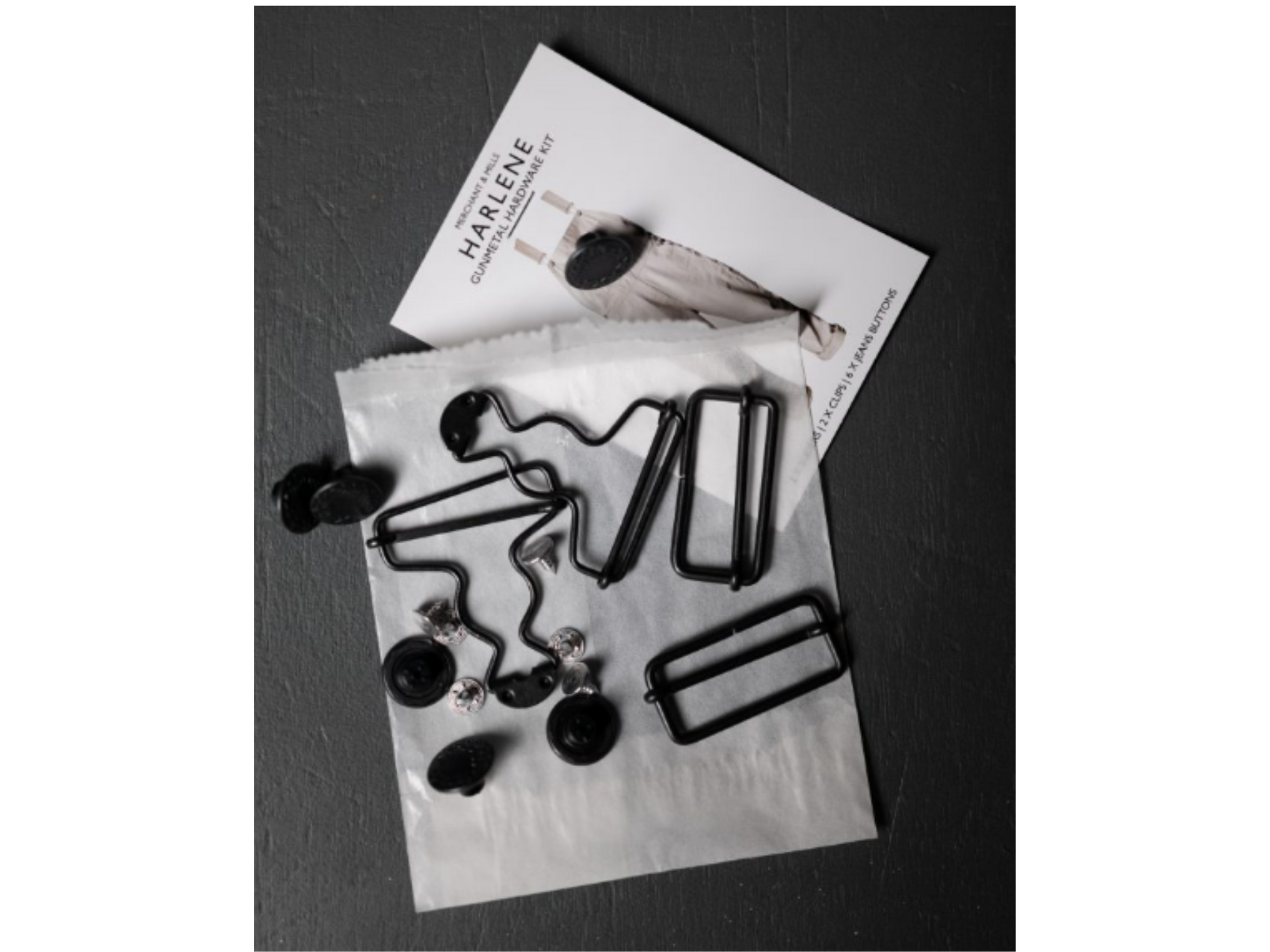 This is a printed pattern including sizes 6 – 18., and the hardwear kit including clips, sliders and hammer on buttoms.