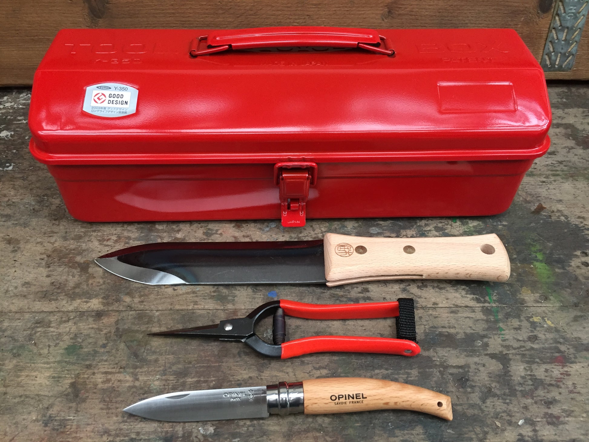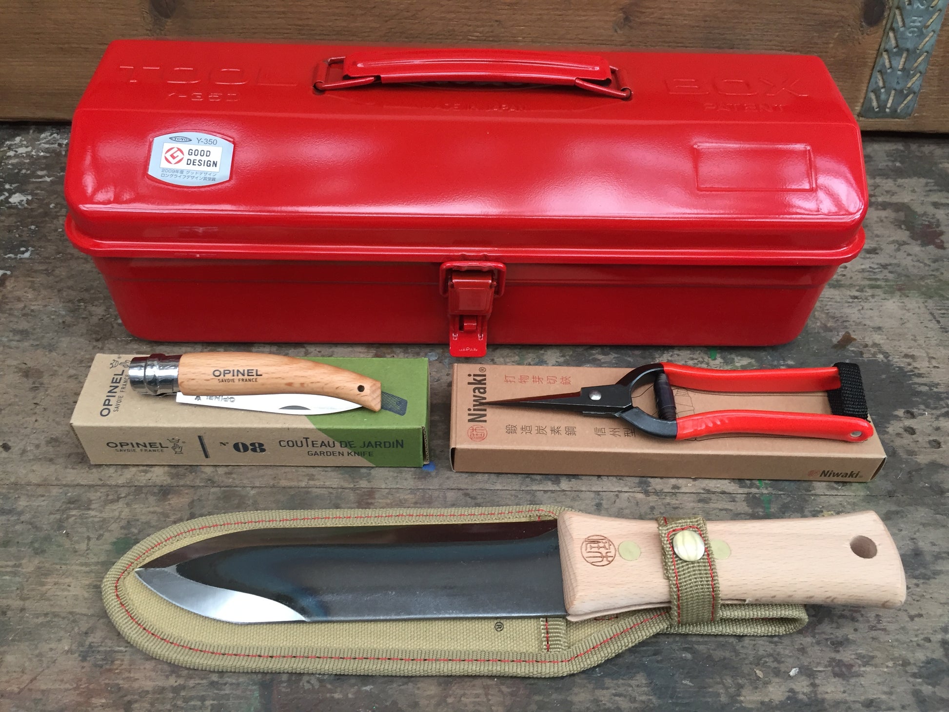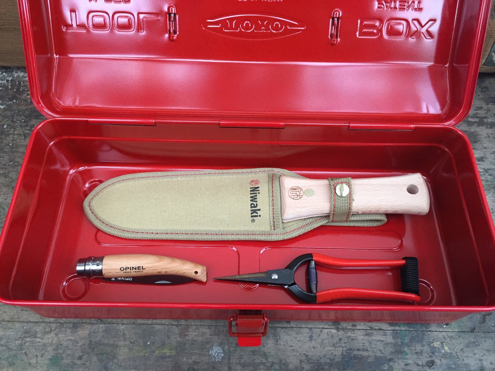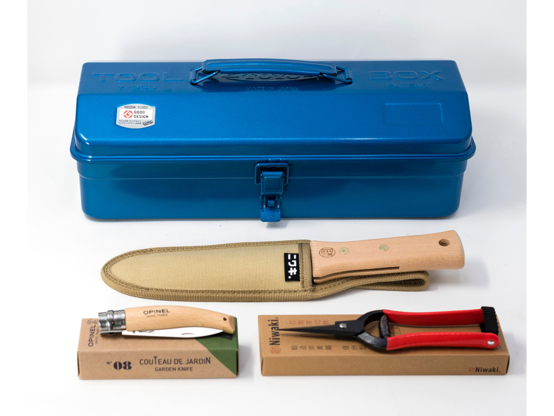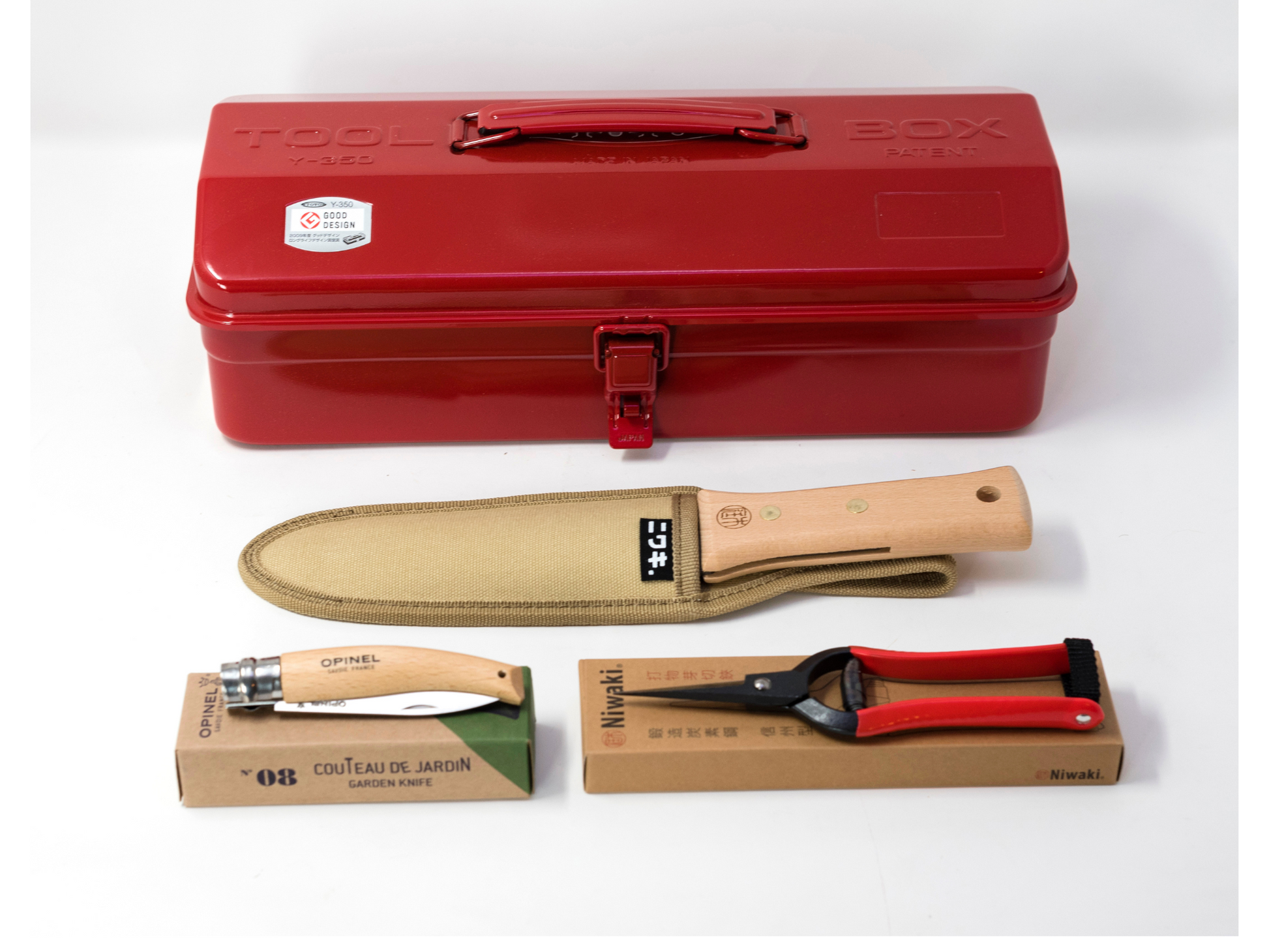 Everything is stored in a high quality steel tool box from Japan. With the supplied tools inside you still have plenty of room to store string, labels and seeds etc - anything else you might need. Think of it as your new (mini) shed. Available in three colours - Red, Blue or Olive and designed to look good enough to be left on show when space is at a premium.