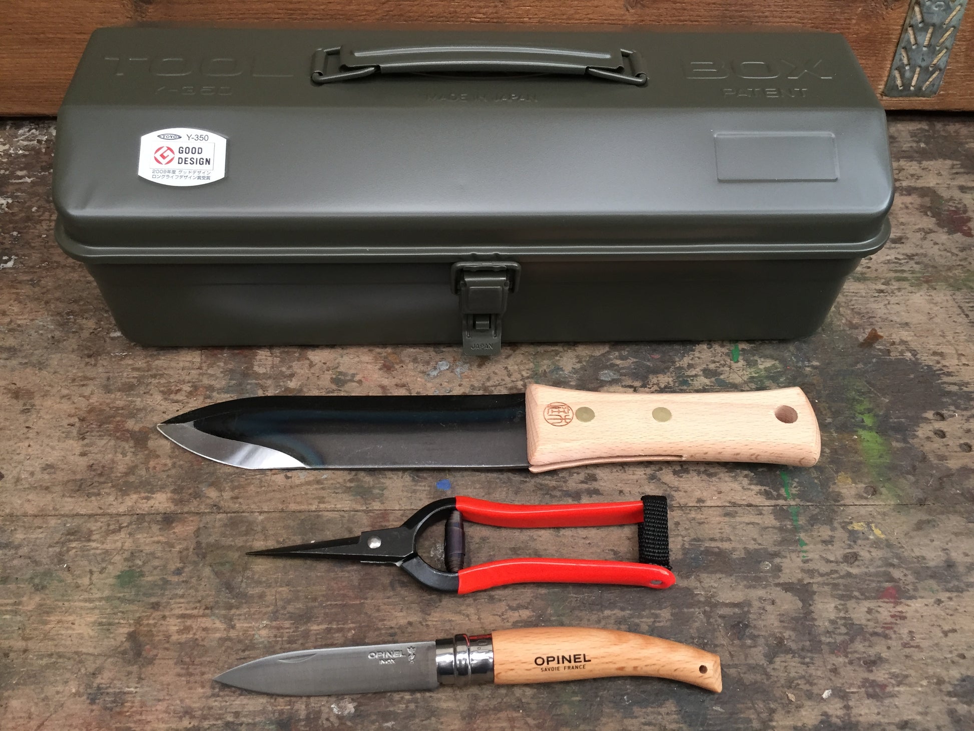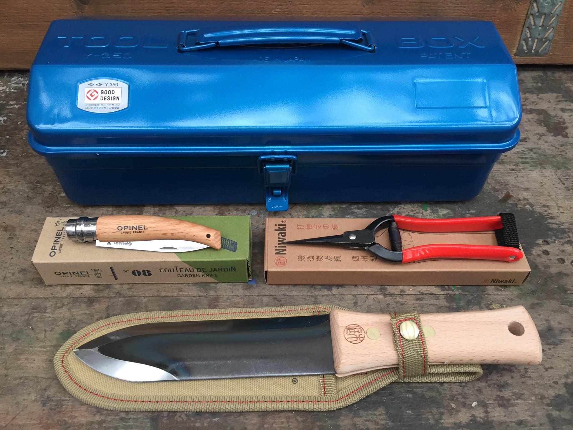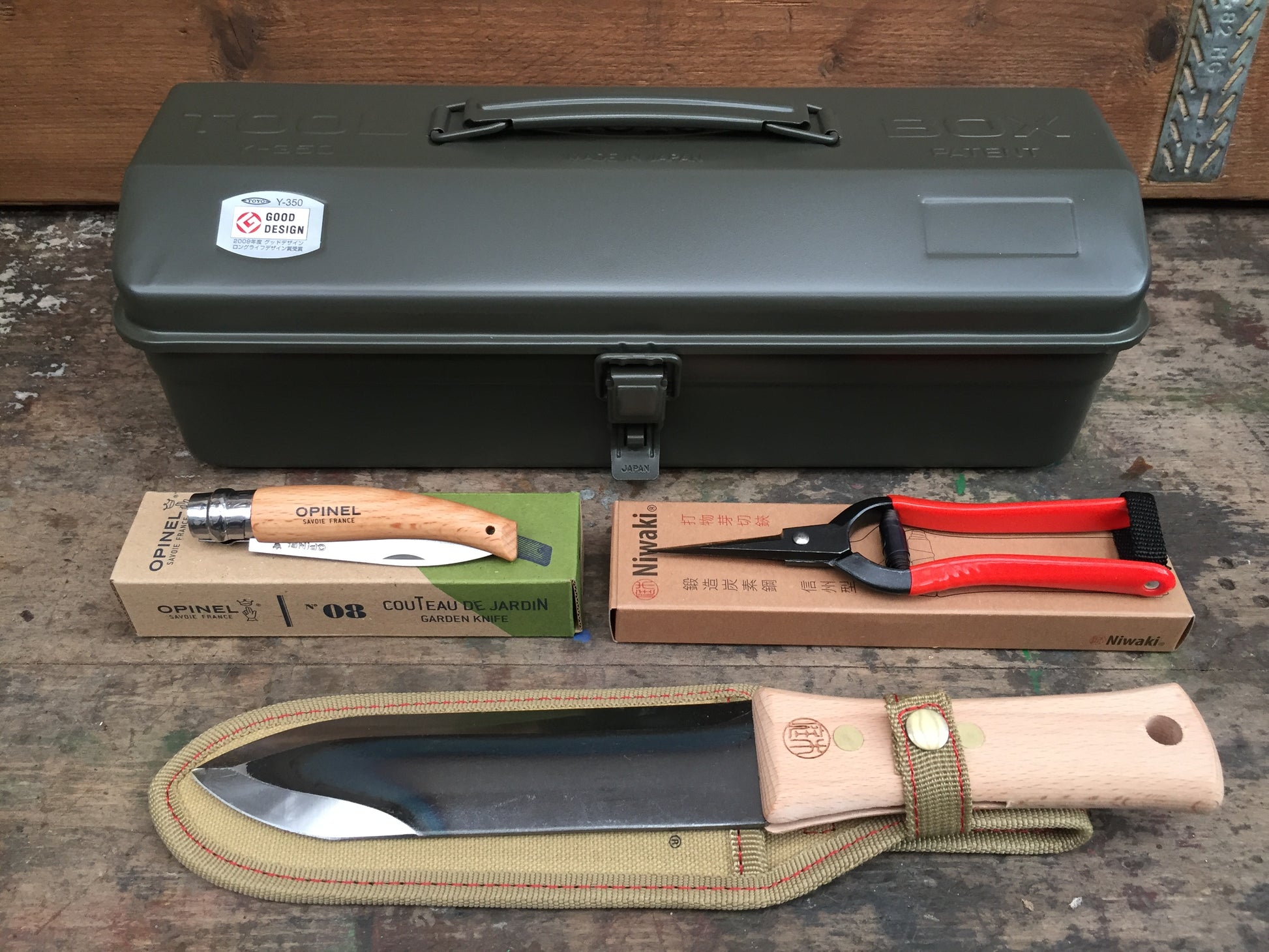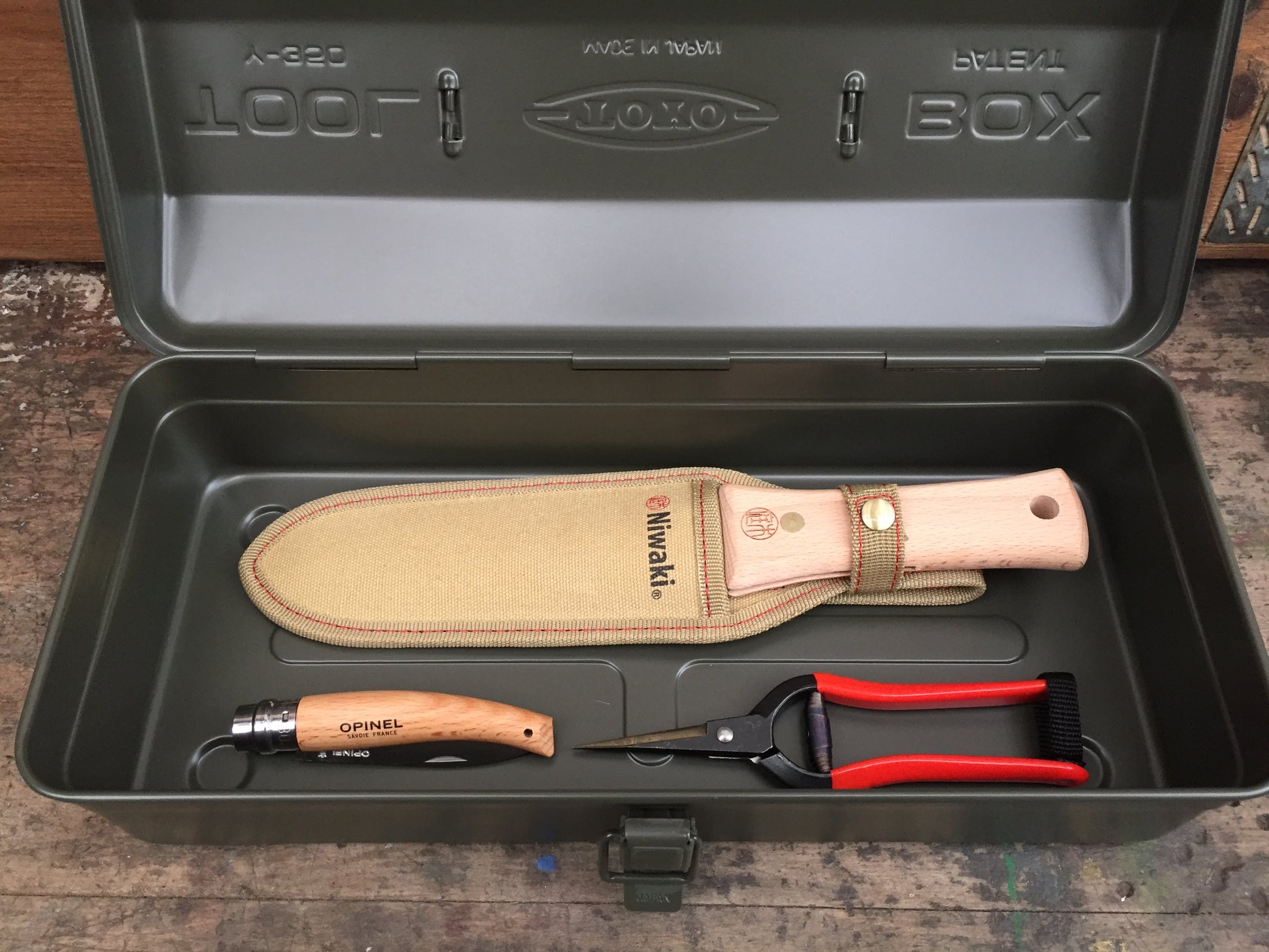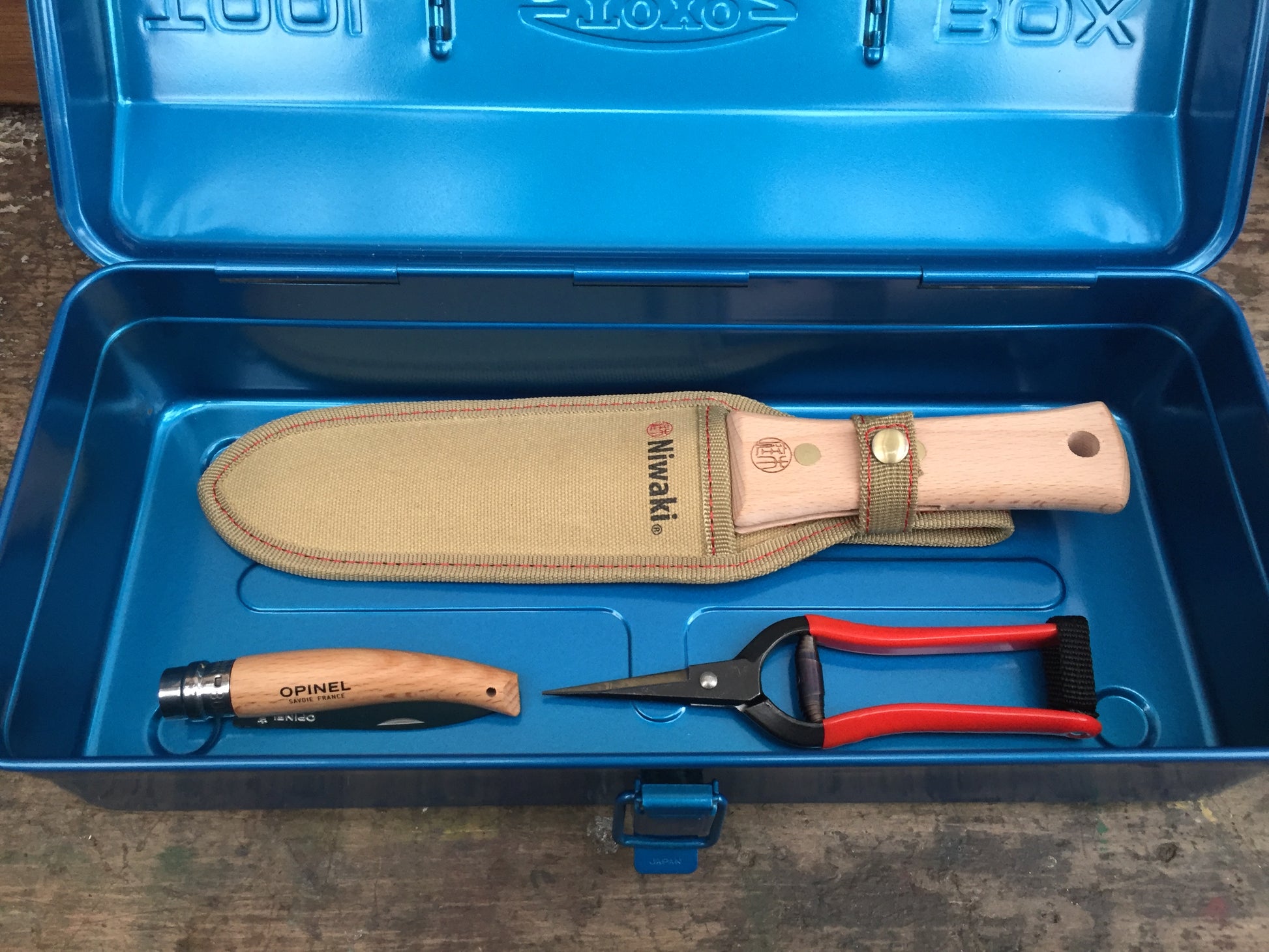 Everything is stored in a high quality steel tool box from Japan. With the supplied tools inside you still have plenty of room to store string, labels and seeds etc - anything else you might need. Think of it as your new (mini) shed. Available in three colours - Red, Blue or Olive and designed to look good enough to be left on show when space is at a premium.