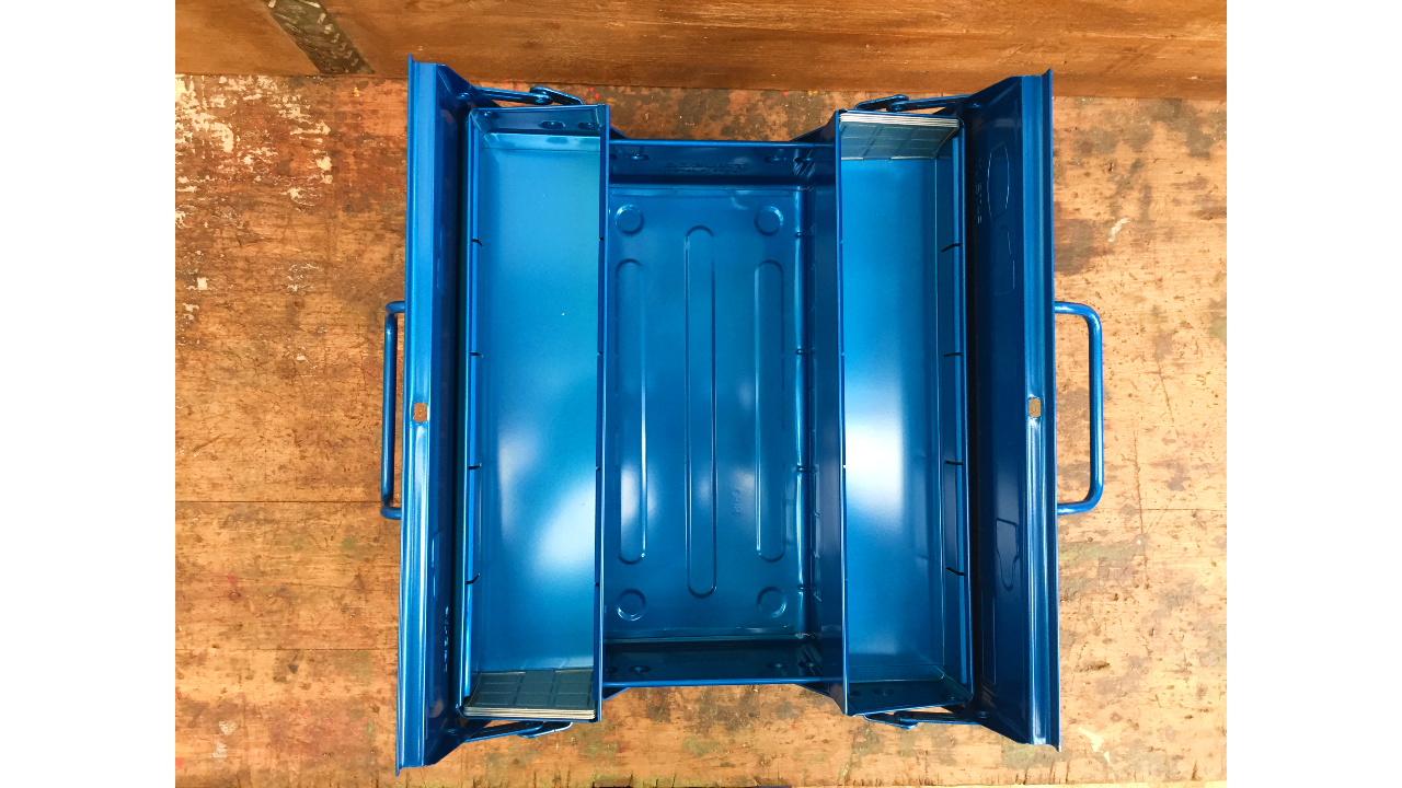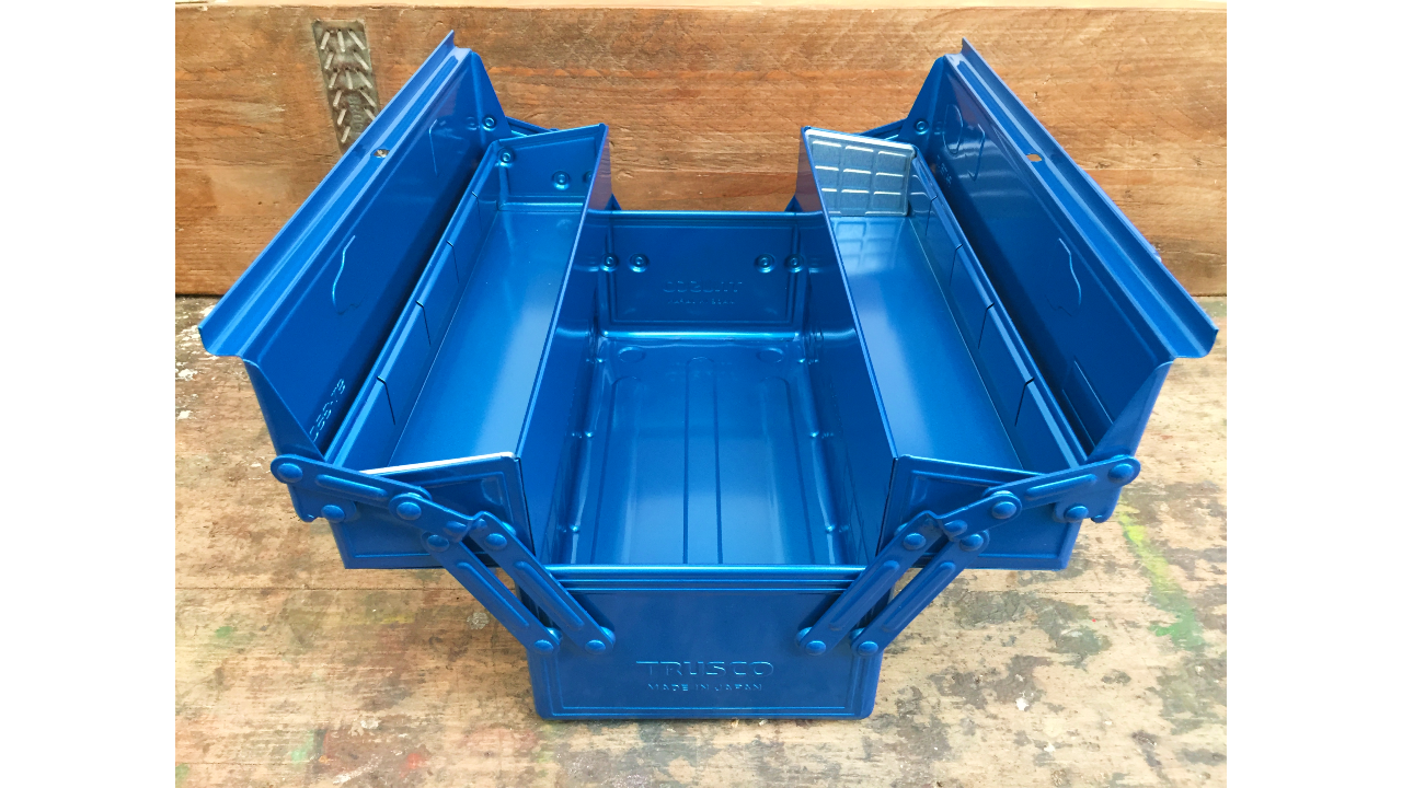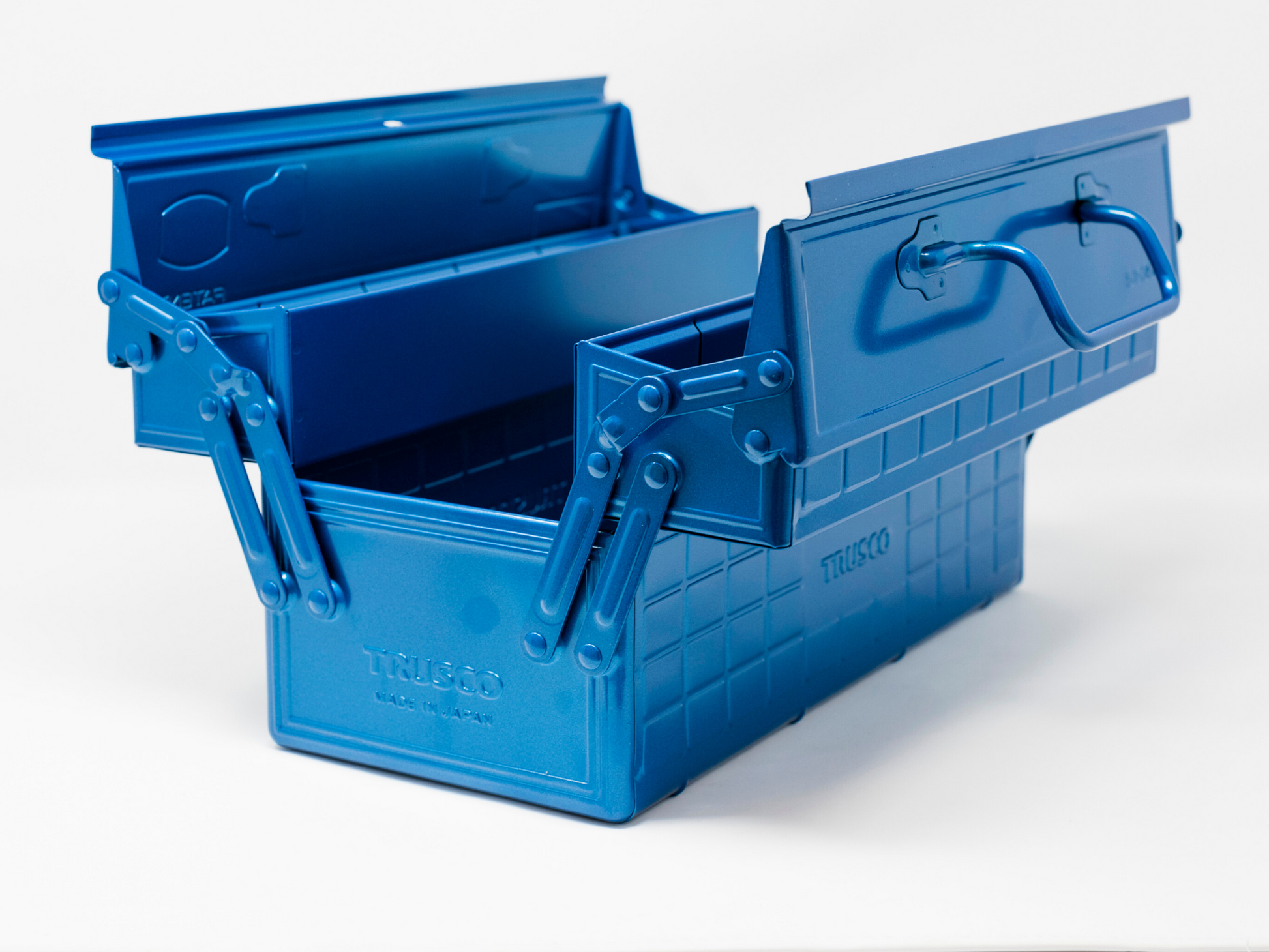 Made in Japan from pressed steel and painted in Trusco's signature blue. This makes the perfect box for storing craft materials, fishing kit and even table top gaming pieces. It's also great as a small tool box - as it was intended to be!